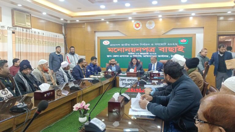 ঠাকুরগাঁও ৩ আসনে ১০ জন প্রার্থীর মধ্যে ৮জনের মনোনয়ন বৈধ ঘোষণা করা হয়েছে। এর মধ্যে স্বতন্ত্র প্রার্থী আশা মনির মনোনয়নপত্র বাতিল ও জাতীয় পার্টির হাফিজ উদ্দিন আহম্মেদর বিরুদ্ধে মামলা থাকা ও মনোনয়ন পত্র সংশোধনযোগ্য ত্রুটি থাকায় তা স্থগিত করা হয়েছে। শনিবার রিটানিং অফিসারের কার্যালয়ে অনুষ্ঠিত মনোনয়ন পত্র যাচাই বাছাই কালে এ ঘোষনা দেন রিটানিং অফিসার ও জেলা প্রশাসক ইশরাত ফারজানা। বৈধ প্রার্থীরা হলো জাতীয়তাবাদী দল বিএনপি মনোনীত প্রার্থী সাবেক এমপি জাহিদুর রহমান জাহিদ, জামায়াতে ইসলামী প্রার্থী মিজানুর রহমান, গণঅধিকার পরিষদ প্রার্থী মামুনুর রশিদ মামুন, বাংলাদেশ মুসলিম লীগের এস এম খলিলুর রহমান সরকার, বাংলাদেশ কমিউনিস্ট পার্টির প্রভাত সমীর শাহজাহান আলম, ইসলামী আন্দোলন বাংলাদেশ-এর আল আমিন, বাংলাদেশ সুপ্রিম পার্টি আবুল কালাম আজাদ ও বাংলাদেশ মাইনোরিটি জনতা পার্টির কমলাকান্ত রায়।