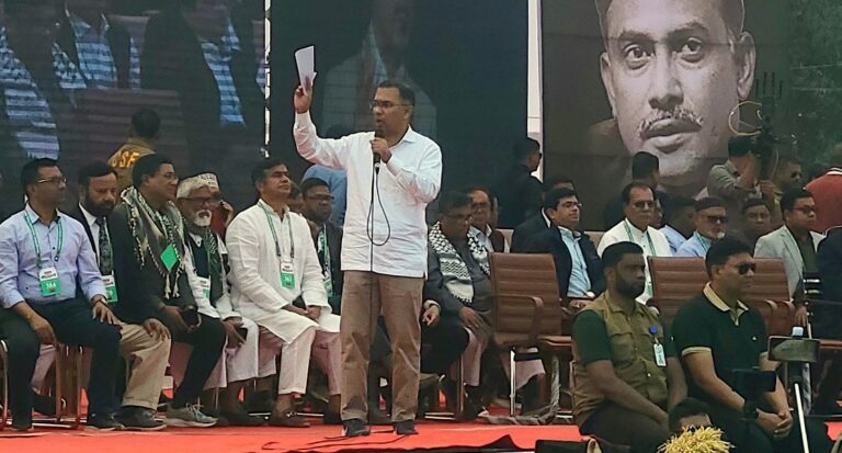 করবো কাজ গড়বো দেশ, সবার আগে বাংলাদেশ” এ স্লোগান দিয়ে মঞ্চে দাঁড়িয়ে বিএনপি চেয়ারম্যান তারেক রহমান বলেন, এদেশের মানুষ ভোটের অধিকার প্রতিষ্ঠার জন্য, কথা বলার অধিকার প্রতিষ্ঠা করার জন্য নিজেদের জীবনকে উৎসর্গ করেছেন। আজ দেশের মানুষের হারিয়ে যাওয়া সব অধিকার ফেরত পাবার সময় এসেছে। ১২ তারিখ নির্বাচন হবে। এবারের নির্বাচন শুধু জনপ্রতিনিধি নির্বাচন করার জন্য নয়, এবারের এ নির্বাচন দেশকে পুনর্গঠন করার নির্বাচন।